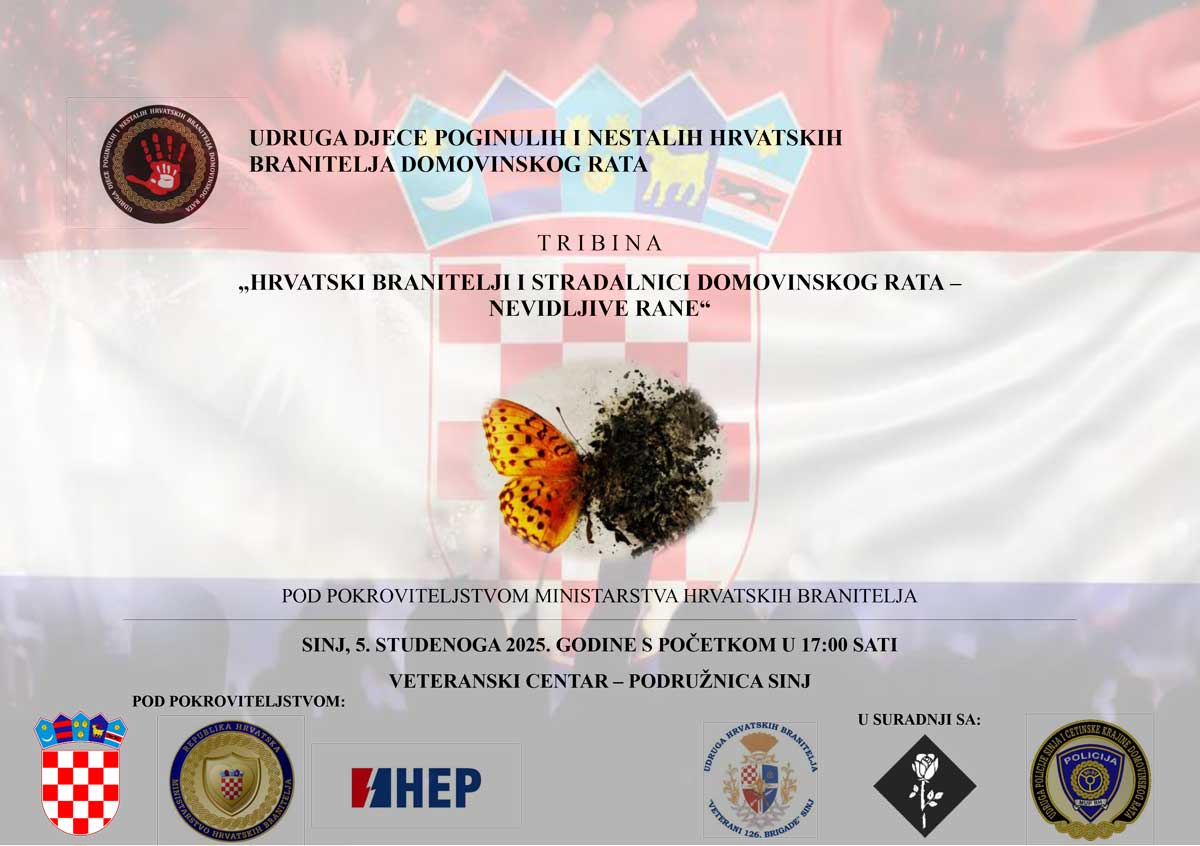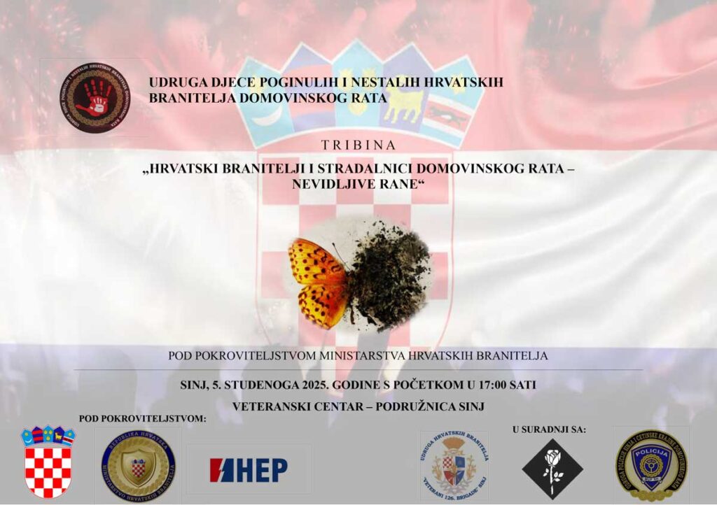 Udruga djece poginulih i nestalih hrvatskih branitelja Domovinskog rata organizira tribinu „Hrvatski branitelji i stradalnici Domovinskog rata – nevidljive rane“ koja će se održati u srijedu, 3. studenoga 2025. godine s početkom u 17:00 sati u Veteranskom centru – Podružnica Sinj, a uz potporu Ministarstva hrvatskih branitelja i Hrvatske elektroprivrede d.d.