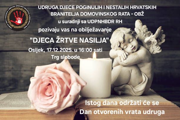 Povodom Međunarodnog dana ljudskih prava pozivamo sve zainteresirane na obilježavanje “Djeca žrtve nasilja” 17. prosinca 2025. godine s početkom u 16:00 sati na Trg slobode u Osijeku, a u organizaciji UDPNHBDR – OBŽ te suradnji s nacionalnom UDPNHBDR.