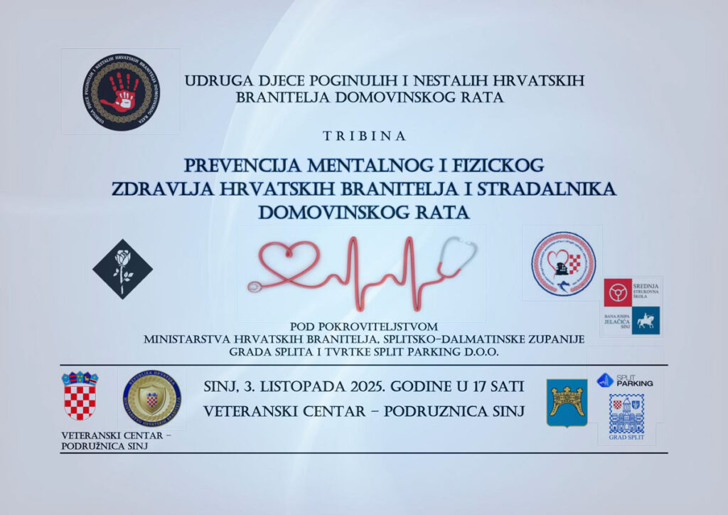Udruga djece poginulih i nestalih hrvatskih branitelja Domovinskog rata organizira tribinu „Prevencija mentalnog i fizičkog zdravlja hrvatskih branitelja i stradalnika Domovinskog rata“ koja će se održati u petak, 3. listopada 2025. godine s početkom u 17:00 sati u Veteranskom centru – Podružnici Sinj, a uz potporu Ministarstva hrvatskih branitelja, Splitsko-dalmatinske županije, Grada Splita te tvrtke […]